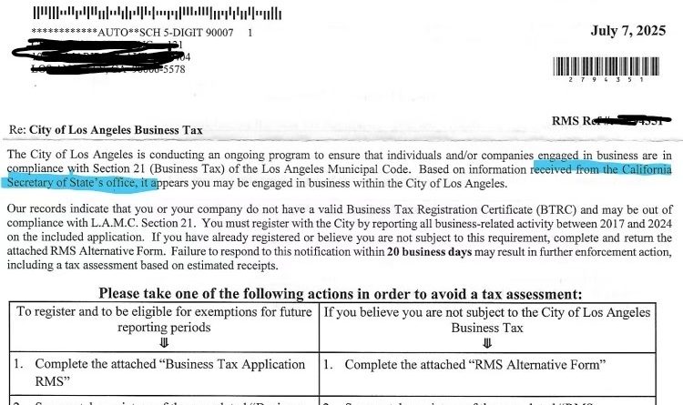 It looks like the City of Los Angeles is now enforcing taxes on home-cased businesses. Previously, this was loosely enforced, if at all. Now, it looks like California Secretary of State is syncing with City of Los Angeles. 看起来洛杉矶市政府现在开始严格执行对家庭办公企业的税务规定。以前这项规定执行得比较宽松,甚至几乎没有执行。现在加州国务卿办公室似乎已经与洛杉矶市政府实现了信息同步。 If you receive a notice like the one...